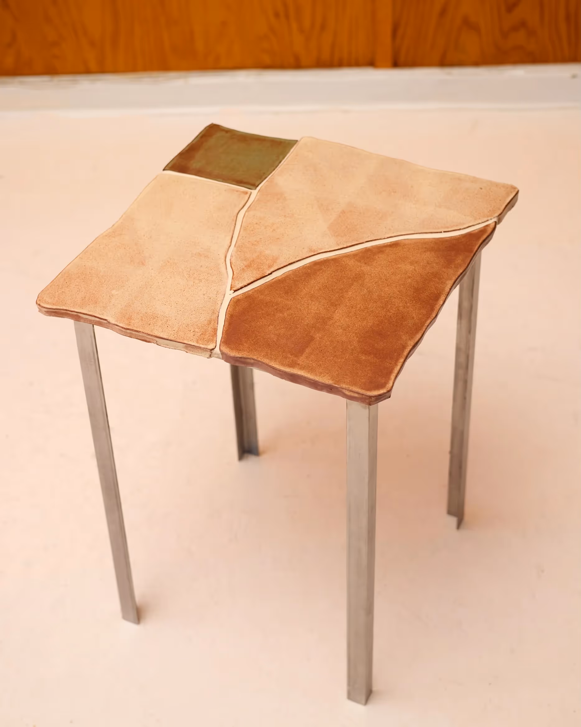 Shino Glazed Ceramic Tiles, Stainless Steel, Blackened Steel, or powder coated legs (outdoor use)
