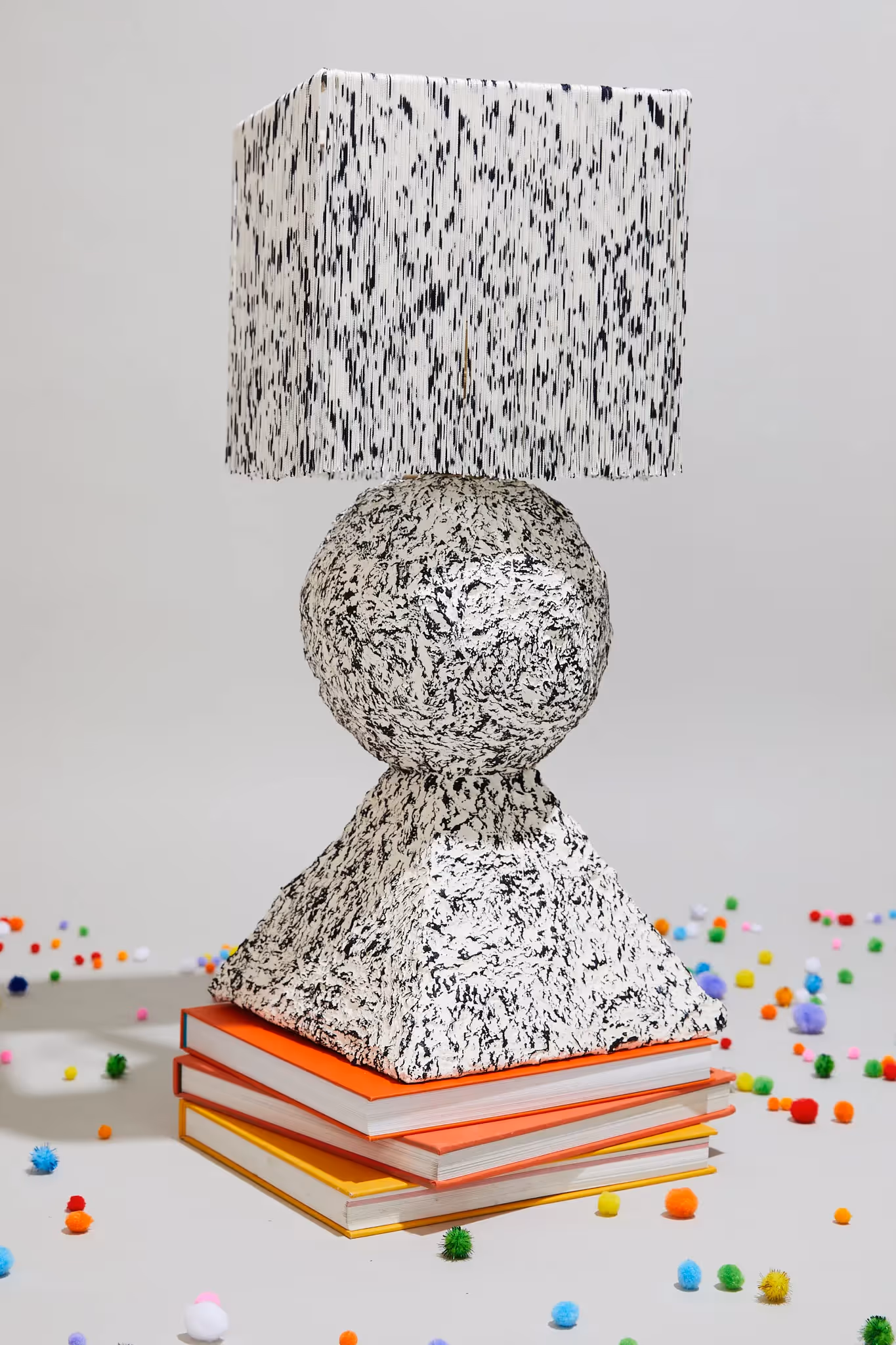 Gypsum with lacquer coating and brushed brass components, Hand painted fringe shade